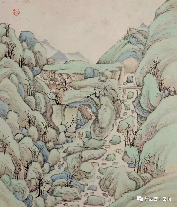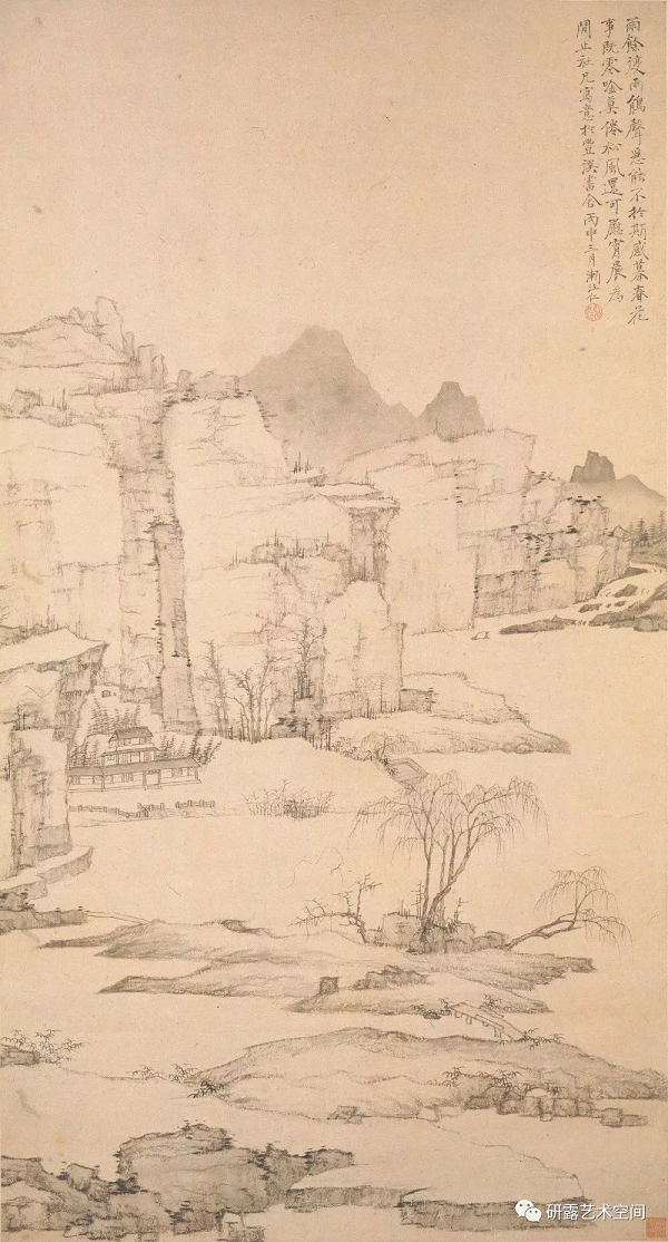 次年(1644年,崇禎甲申)他畫的《春島琪樹圖》(故宮博物院藏)作高遠(yuǎn)云山泉瀑,用方折枯勁之筆作方形山石,并綴以小圓點(diǎn)疏疏密密為苔,復(fù)敷以小青綠。全圖筆墨精良、檔次清晰,卻具有平面感與郊外裝飾效果。這樣的畫,可以讓人聯(lián)想到文征明的細(xì)筆畫,即叫做的“細(xì)文”,但已有了較大的變化。