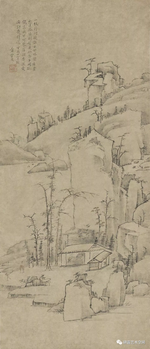 筆者在對可覓的蕭云從傳世作品審閱分析后,對于他的畫途追求與風(fēng)格形成,有了進(jìn)一步的認(rèn)識。他是少年即“篤志繪畫,寒暑不廢”(見1649年其作《蒼山高隱卷》畫后題識),但其現(xiàn)存早期作品甚少。最早的師承情況尚不清楚。上海博物館藏蕭云從《仿古山水冊》(紙本、設(shè)色,計(jì)8開)是我所見到的他最早作品。此冊分別意仿倪瓚、吳鎮(zhèn)、米芾、米友仁、董源、孫君澤等,題識兼用篆、隸、楷、行、草諸體。冊中未署年款,仿董源一圖題曰:“董北苑筆墨乾淡,遂與右丞分南北宗。國朝惟華亭太史獨(dú)能闡揚(yáng),后來者濫觴矣!”正在董其昌(華亭太史)前冠以“國朝”二字,可以證實(shí)其時(shí)必在明,且正在明末騷亂事先。此冊所繪,層次清晰,繁復(fù)多變,尚未形成蕭氏特定風(fēng)格,大約為其四十歲前后作。它給了我們?nèi)绱斡嵪ⅲ?一)他贊賞董其昌對于山水畫的“南北宗論”,并以南宗為本,取法南宗諸大家。(二)他的取法又頗具主見。他在仿倪一圖上題曰:“倪高士取唐句為圖,用深青綠,雖濃厚而實(shí)淡雅,惟自娛而已。后人掩拙謂前輩不甚著色,豈不誣耶!”他的這一觀點(diǎn),真的最后成了他的風(fēng)格之一種,即以枯淡之筆勾皴,復(fù)加青綠敷染。(三)他還能突破“南宗”,偶師北宗畫家,此冊中仿孫君澤一頁即是。孫為元代晚期杭州畫家,山水、人物師承馬遠(yuǎn)、夏珪。他題識曰:“宋元間有孫君澤名巨源,作畫以乾淡為深厚,倪黃嘗宗之,至取境幽奇則不可及。余見其蹤,吮筆貌之,以明古人所學(xué)之博。”可見,他關(guān)于今人的師承,意正在一個(gè)“博”字。這大概就是韓昂說的“不宋不元”,亦張庚所言“不專宗法”吧!