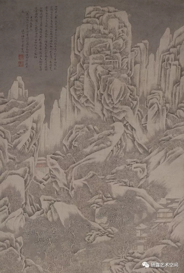 再往后的《雪景山水》(1650年,55歲)、《雪岳讀書》(1652年,57歲)二圖皆為故宮藏品,皆為大幅雪景且用乾筆勾勒、微微皴擦、淺淡烘染之法;行筆造型多取方析,方折中又含有渾拙之趣;筆下貌似瑣碎而氣脈貫通,整體氣1象高古蒼潤。而這樣的繪畫面目,正好呼照應(yīng)著《太平山水圖畫》。所以我們可以做出結(jié)論:50歲前后的蕭云從,自成一格的繪畫方法和繪畫面貌已經(jīng)形成。