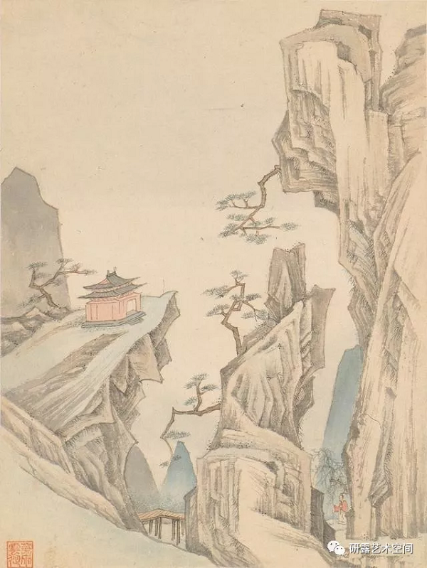 如此,咱們便能夠明確,正在弘仁畫藝發(fā)展期間曾受到蕭云從的影響,并借鑒過蕭氏的某些辦法。他那最為一般的方折挺拔的筆墨風(fēng)神,無疑承繼著倪瓚的藝術(shù)特質(zhì),是否也是從蕭云從的畫風(fēng)中獲得啟示的呢?筆者看到蕭氏1654年59歲為子翁所繪山水冊(10開,上海博物館藏),畫法與弘仁《黃山圖冊》較為近似。此年弘仁45歲,是其繪畫風(fēng)格開始形成的時(shí)期。后兩年,他所作的《仿倪山水》(故宮博物院藏)與《雨余柳色圖》(上海博物館藏),其基本筆墨式樣與風(fēng)格已經(jīng)成形。根據(jù)縱橫的比較,似可把《黃山圖冊》列入弘仁40歲后,46、47歲之先的寫生作品。其時(shí),他還不能徹底擺脫蕭云從的筆墨影響。對于這本冊頁,還有一些因素是可以考慮的:它大概或許是寫生的稿本,所以某些局部尚覺粗糙,尺寸也不盡統(tǒng)一,也未能署上名款,而黃山景色的名稱,則是友人或者后人補(bǔ)書的。