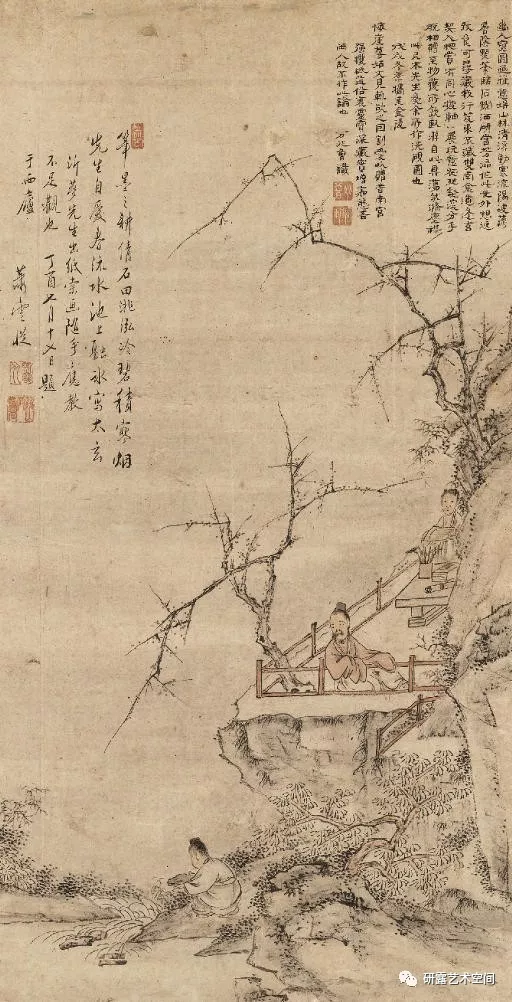 蕭云從,安徽蕪湖人,出生于明萬歷二十四年(紀(jì)元1596年),卒于清康熙十二年(紀(jì)元1673年),享年78(見胡藝《蕭云從年譜》。另有一說,謂其卒于1669年,享年74。而此年中蕭云從還有不少杰作世傳,如故宮所藏《松石圖》3米長大卷,雄健蒼勁,可見還很健康。)字尺木,號默思、無悶道人等。明亡后稱石人、鐘山老小、鐘山梅下,前者隱含對于時(shí)世的“愚頑”,后者則寓有懷念鐘山明陵之意。明崇禎十一年(1638年),他與弟云倩一起加入了與東林黨主旨一致的復(fù)社。蕭云從的一生,逾越明清,在明49年,在清29年。崇禎9年、15年,兩科副貢,入清不仕,是典型的遺民畫師。