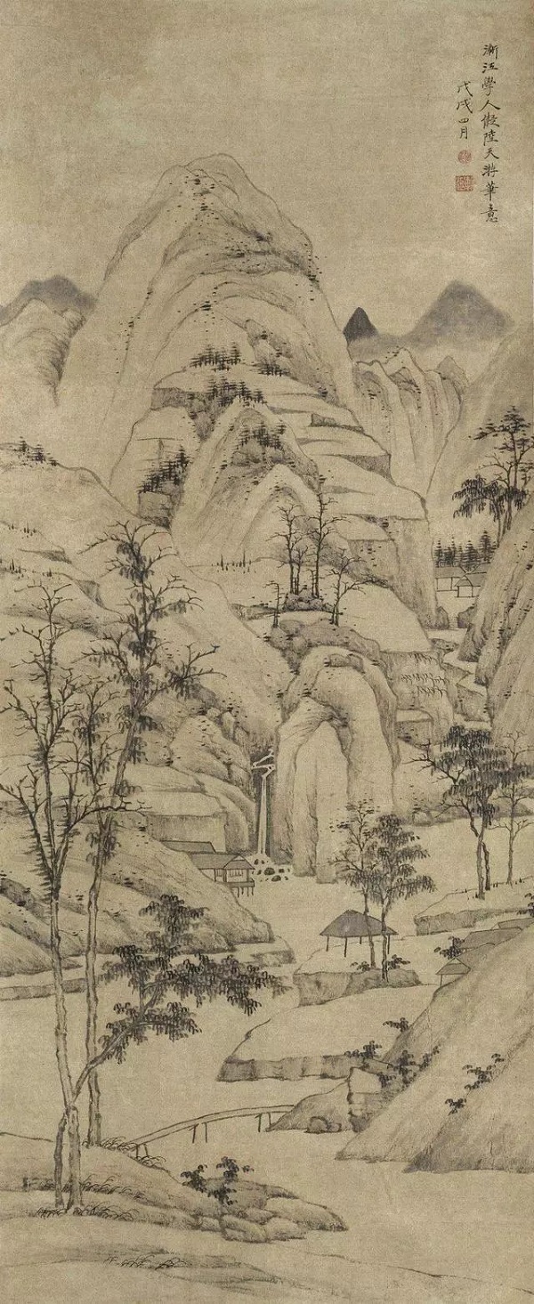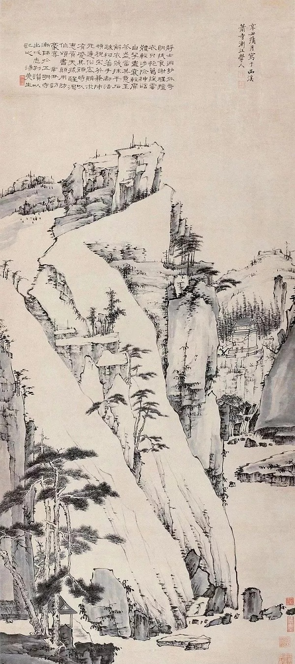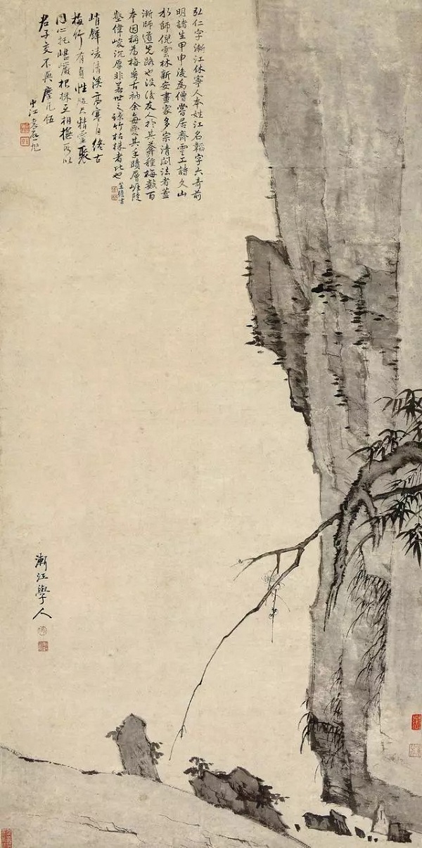 清初四僧中,弘仁要算是一個出家后與塵世脫離得最徹底的,他涵養深厚,出家后,每日掛瓢拽杖,芒鞋羈旅,或長日靜坐空潭,或月夜孤嘯危岫,儼然一不食人間煙火的世外高人。