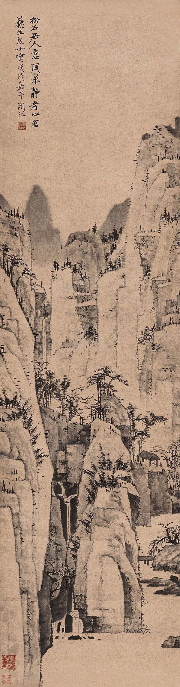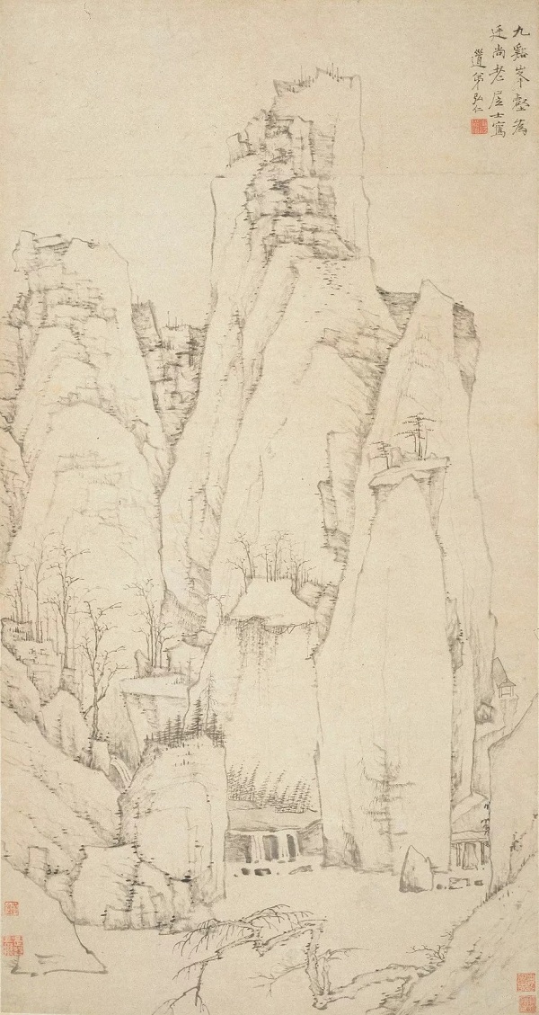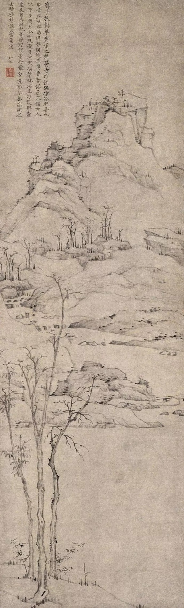 弘仁畫從宋元各家入手,尤崇倪瓚畫法,但其作品格調不同于倪瓚,少荒涼寂寞之境,而多清新之意。