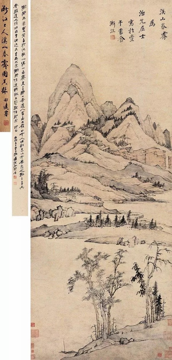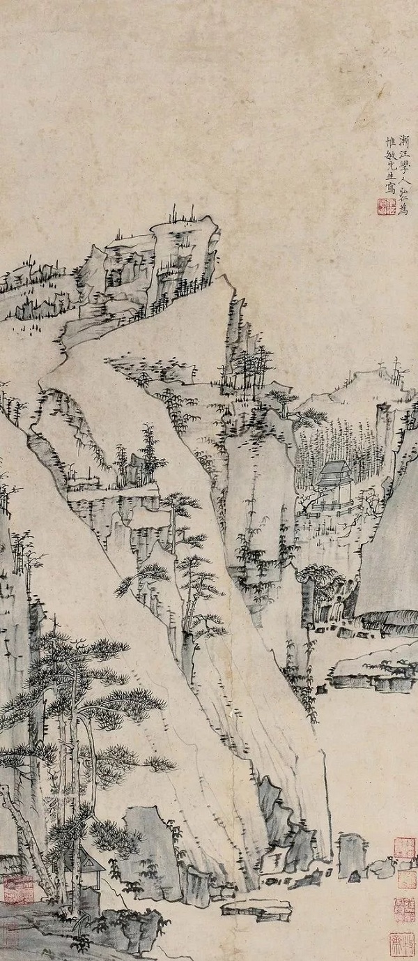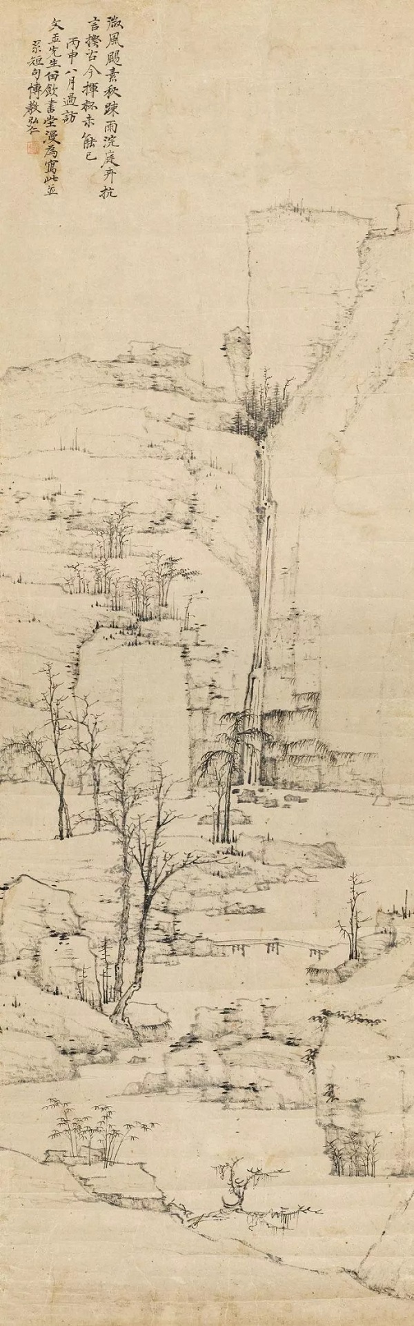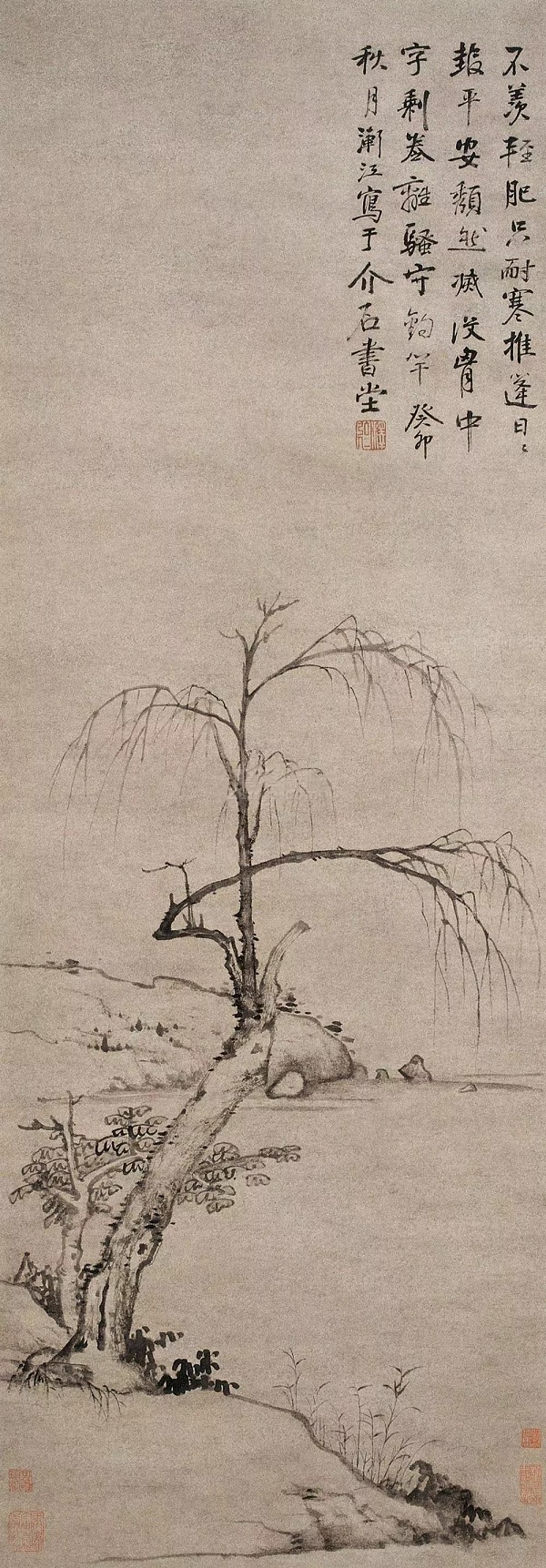 弘仁畫從宋元各家入手,尤崇倪瓚畫法,但其作品格調不同于倪瓚,少荒涼寂寞之境,而多清新之意。