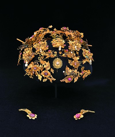 宋代頭飾,材質為金、鐵、紅寶石、珍珠,工藝可見花絲鑲嵌