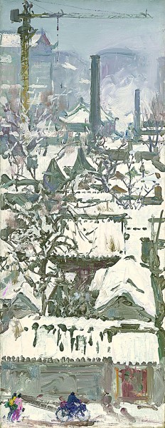 靳之林的油畫《雪中的北京四合院》(圖②)以四聯組畫的形式表現了一天中不同時段的胡同場景。鳥瞰視角下,街道、建筑、煙囪、塔吊等景物的輪廓形成縱橫交錯的線條,巧妙分割了畫面,使構圖井然有序,充滿節奏感和形式意味。莊言的油畫《東單北極閣頭條》和莫大風的油畫《胡同一角》都描繪了烈日下的胡同景色。兩件作品的共同點是畫面元素較少,卻十分耐看。畫家以多樣的筆觸為建筑、天空增添了肌理細節,同時巧妙利用胡同內路面、建筑、樹木、人物與太陽光源的位置關系,打造出豐富的光影層次,使本來單調的場景變得生動,充滿看點。