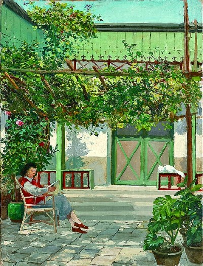 如果將錯綜復雜的胡同比作散布在北京城區里的毛細血管,那么點綴其間的一座座各具特色的四合院,就如同那些依賴毛細血管輸送營養的“細胞”。試看吳作人的油畫《小院》(圖④),高搭的天棚、盛放的鮮花、酣睡的小貓,以及院中正專心致志看報紙的妻子……畫家筆下愜意的日常一景,不禁讓人想到關于四合院生活的北京俗語“天棚魚缸石榴樹,先生肥狗胖丫頭”。
