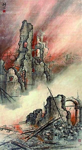 1931年,九一八事變爆發(fā)。國(guó)難當(dāng)頭,激發(fā)了藝術(shù)家們奮發(fā)圖強(qiáng)的決心。何香凝等國(guó)畫家與中國(guó)畫會(huì)等國(guó)畫家組織,通過(guò)舉辦“救濟(jì)國(guó)難書畫展覽會(huì)”“全國(guó)藝術(shù)家捐助東北義勇軍作品展覽會(huì)”等活動(dòng),發(fā)動(dòng)國(guó)畫家為前線募捐,凝聚后方力量,鼓舞抗戰(zhàn)斗志。國(guó)畫家王柱材在《改革國(guó)畫的意見》中談到彼時(shí)中國(guó)所需要的藝術(shù)時(shí)表示:“只有創(chuàng)造了,創(chuàng)造我們內(nèi)心所受的創(chuàng)痕,創(chuàng)造我們看到殺人的悲慘,更要?jiǎng)?chuàng)造我們所不能受的帝國(guó)主義殘殺我們的同胞們……這才是現(xiàn)在中國(guó)所需要的藝術(shù)。”呼吁國(guó)畫家拿出反映現(xiàn)實(shí)的勇氣。國(guó)難寫照和抗戰(zhàn)紀(jì)實(shí),成為抗戰(zhàn)時(shí)期國(guó)畫引人矚目的創(chuàng)作題材。沈逸千繪《有家歸不得的關(guān)東人》,表現(xiàn)流離失所的東北同胞,高劍父繪《東戰(zhàn)場(chǎng)的烈焰》(圖②),描繪了被日軍炸成廢墟的上海閘北東方圖書館。