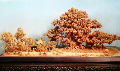 早在宋代,張伯玉、蔡襄、程師孟等人到福州任知州時便倡導廣植榕樹,至街頭河畔榕蔭滿地,暑不張蓋,福州因此亦有“榕城”之雅稱。榕樹可長成巨大的樹冠,主干上常有繁密的氣生根垂下,葉片形狀多樣,如橢圓形、卵形等,且排列緊密。這些特點給以榕樹為主題的軟木畫創作帶來了挑戰。試看臺座式軟木畫《閩韻古榕王》,作品以福州國家森林公園內的“榕樹王”為主要表現對象。據記載,該樹的種植歷史可追溯至北宋時期,其樹冠冠幅達1300平方米,圍徑約10米,每逢夏日可容納千余人乘涼避暑。面對千年榕樹王蒼虬蓊郁的雄姿,創作者匠心獨運,先以精湛刀工雕刻出每一片樹葉,再將這些樹葉分組拼貼為立體造型,同時確保每組的大小、形態有所區別,最后再將這些立體部件組合為整體樹冠,既展現出榕樹枝葉的繁茂,又使其顯現出韻律感與層次感。在一米見方的臺座上,通過與周遭樹木和亭臺的對比,千年榕樹王的雄偉氣勢愈發凸顯,那歷經歲月磨礪的滄桑與厚重,如同無聲的詩,訴說著福州古城的悠長歷史與文化底蘊。