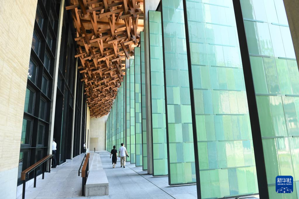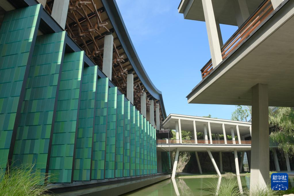 杭州國家版本館屋頂的木構和青瓷門扇相映成趣(7月23日攝)。
