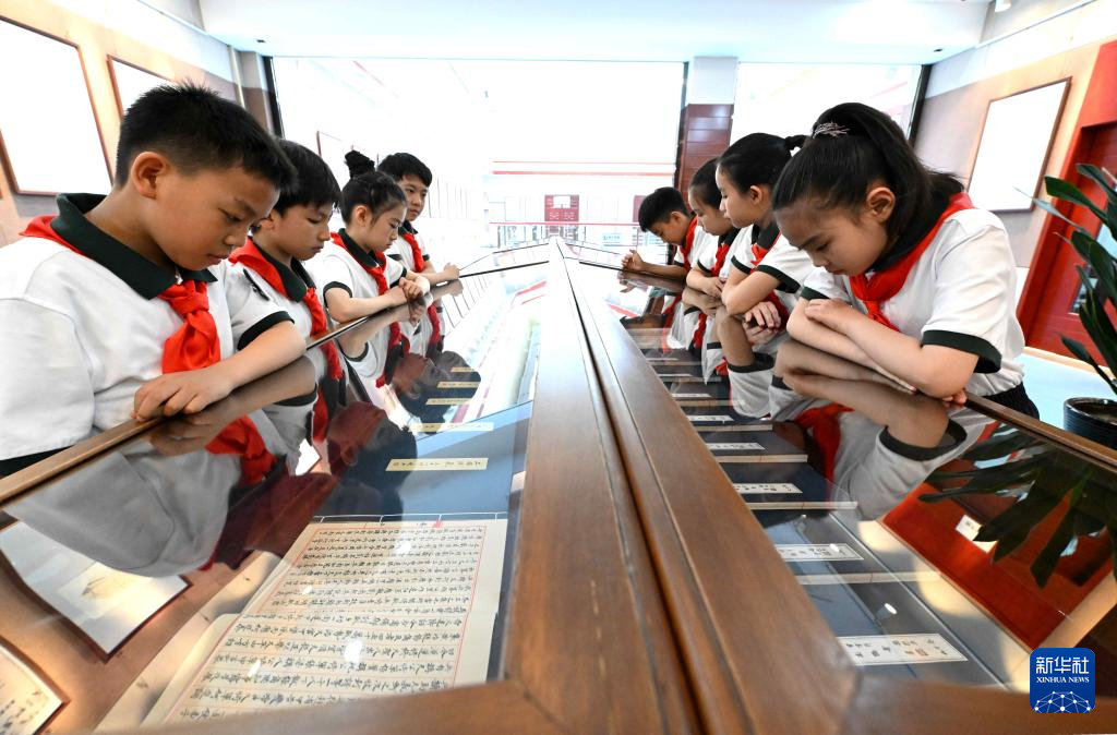 ?4月21日,石家莊市實驗小學學生在石家莊市圖書館參觀手抄中國名著展覽。