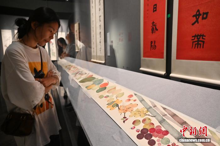 圖為丁仁的《設(shè)色百果圖》吸引參觀者。中新社記者 陳楚紅 攝