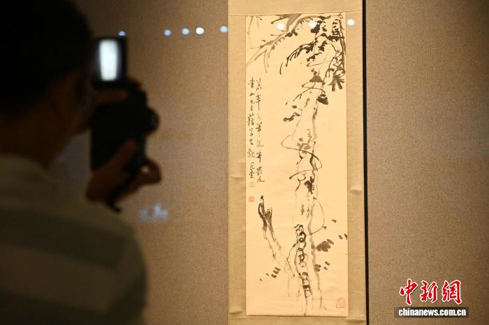 圖為饒宗頤的《水墨藤木圖》吸引參觀者拍照。中新社記者 陳楚紅 攝