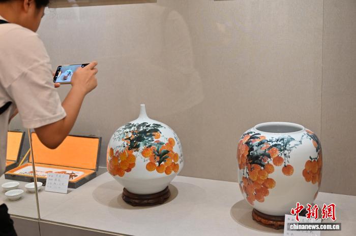 ??7月19日,“七月荔枝紅”主題書(shū)畫展展出的釉上五彩作品《大荔圖》吸引參觀者。近日,該展覽在廣州市廣州圖書(shū)館展出,以嶺南荔枝為主題,展現(xiàn)廣州白云區(qū)鄉(xiāng)村振興與嶺南文化魅力。中新社記者 陳楚紅 攝