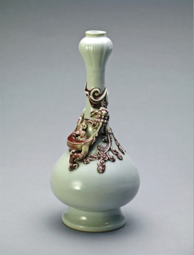 白釉塑貼鮮紅蟠螭蒜頭瓶 明嘉靖