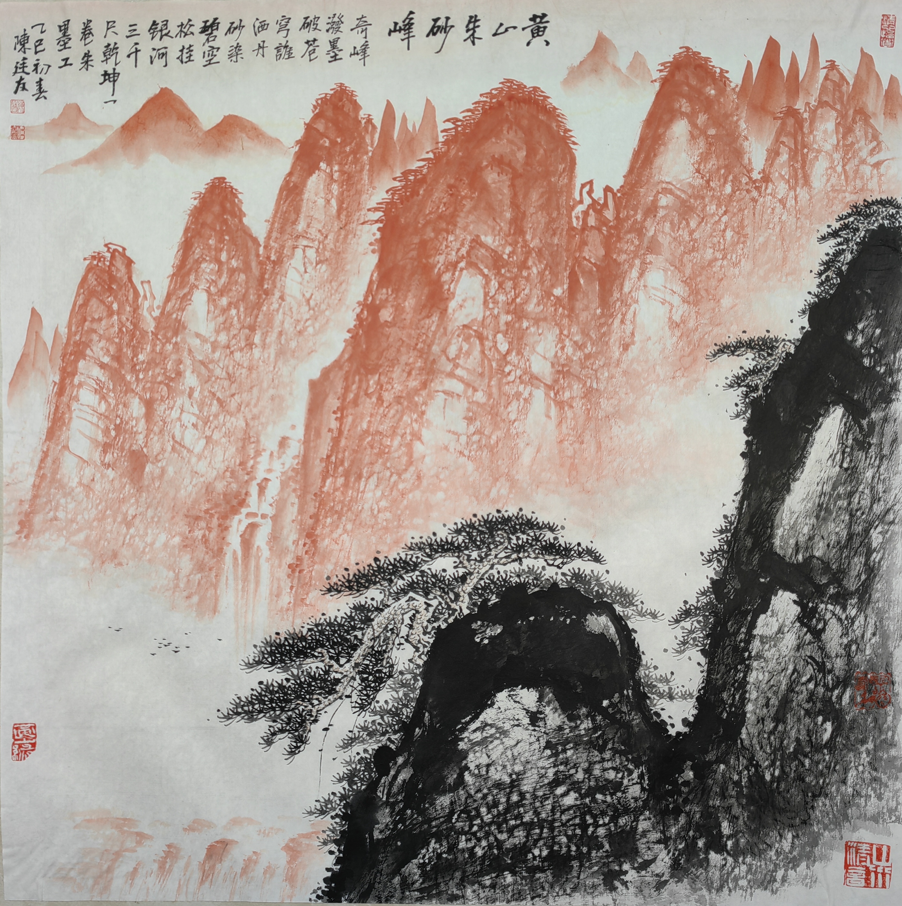《黃山朱砂峰》以世界文化與自然雙遺產地黃山為創作母題。陳廷友以深厚傳統筆墨為根基,融個人山水感悟,將朱砂與水墨巧妙交匯:云海奔涌,奇峰兀立,墨色淋漓而層次分明,既承“外師造化,中得心源”之古意,又顯現代審美之新意,贏得國際評審一致贊譽。